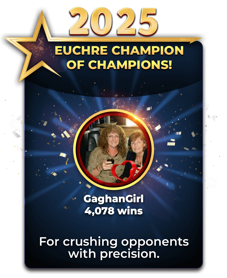 Awarded to the player who left (abandoned) the most games mid-match in 2025. - Euchre Champion of Champions! — For the ultimate winner of the year. Awarded to the player with the highest number of games won in Euchre in 2025.
